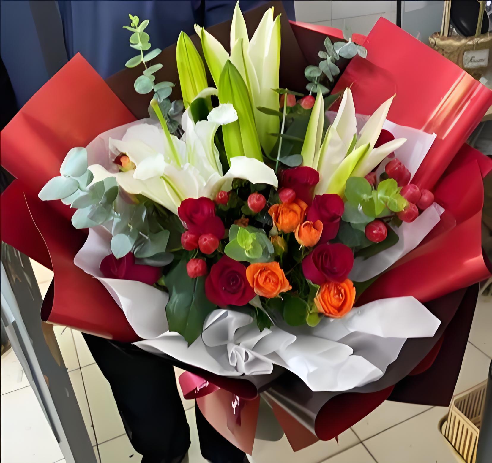滨州博兴县花店包11枝红玫瑰、2枝多头白百合、6枝橙色多头玫瑰、红豆、尤加利叶